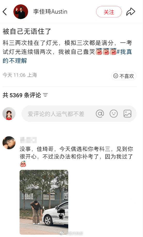 虎撲11月06日訊 李佳琦發(fā)文:“科三兩次掛在了燈光,模擬三次都是滿(mǎn)分,一考試燈光連續錯兩次,我被自己蠢哭?!崩罴宴苑Q(chēng)2022年計劃考駕照,因工作繁忙多次推遲。今年9月10日,李佳琦曬圖宣布科目一92分順利通過(guò),此前他曾發(fā)視頻表示首次科目一模擬考試僅得了11分,第二次36分,第三次55分。10月4日,李佳琦宣布科目二考試順利通過(guò),實(shí)現“一把過(guò)”。