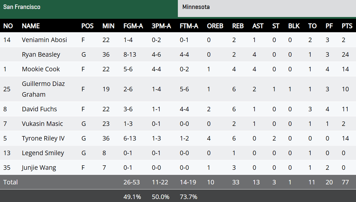 虎撲11月23日訊 NCAA常規賽,舊金山大學(xué)77-65戰勝明尼蘇達大學(xué)。王俊