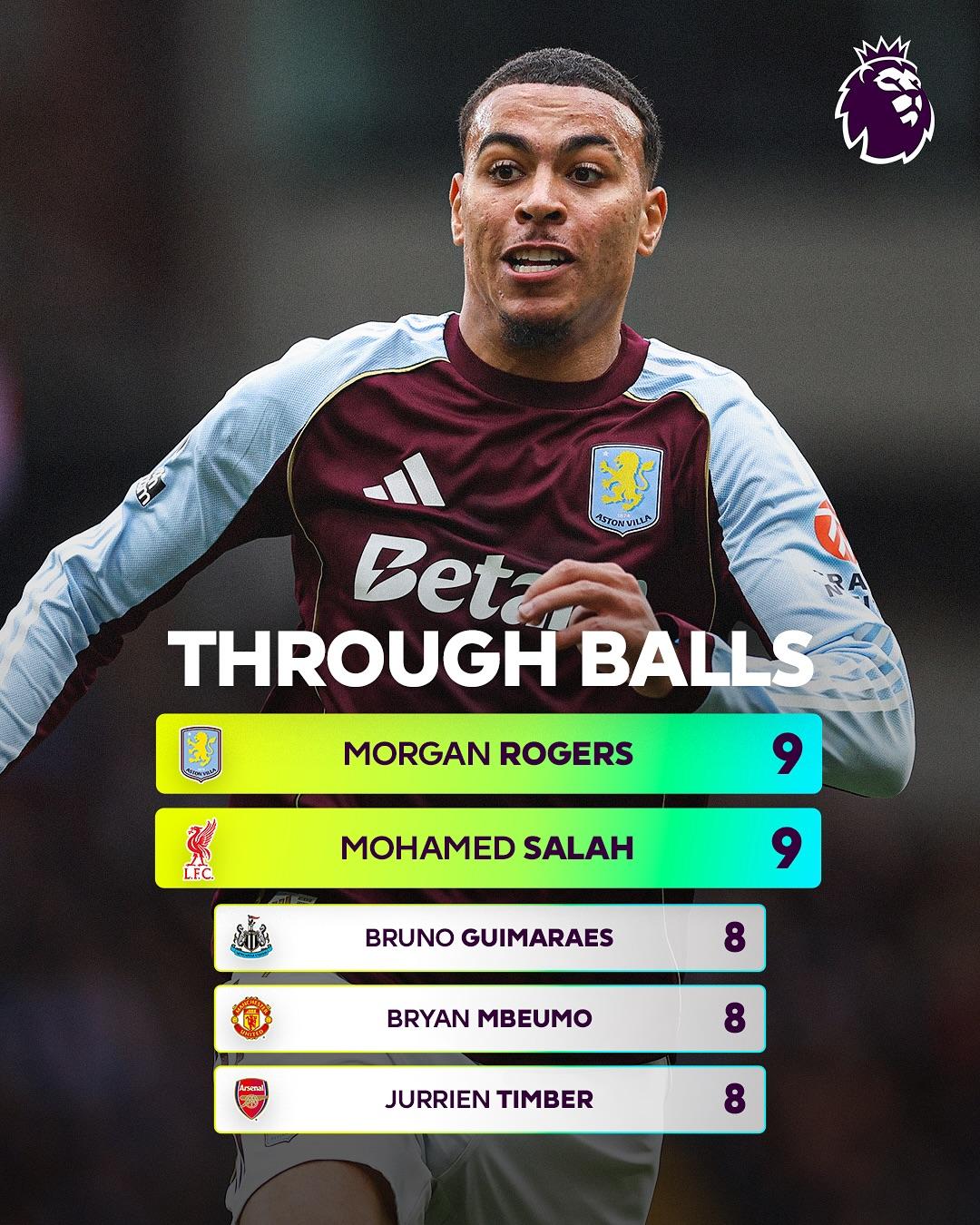 虎撲11月13日訊 英超官方數據統計本賽季至今英超球員送出直塞球次數,羅杰斯、賽季送出數羅薩拉薩拉赫并列第一。英超