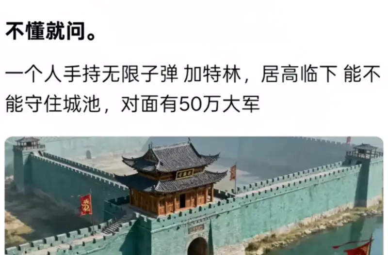 對面有50萬(wàn)大軍,一個(gè)人手持無(wú)限子彈加特林,居高臨下能不能守住城池?