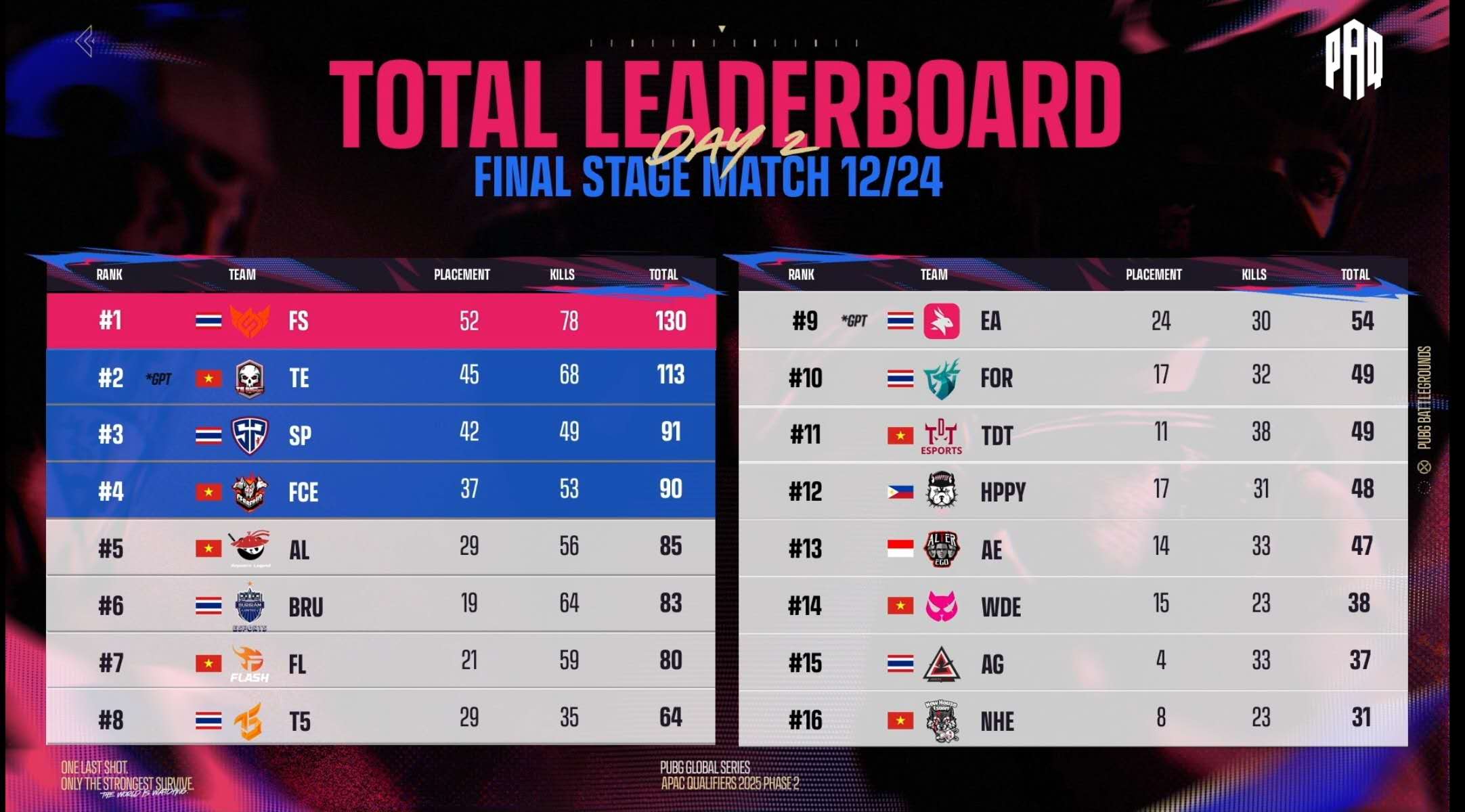 虎撲09月26日訊 PGS亞太預選賽決賽第二日結束:FS單日三雞殺上第一