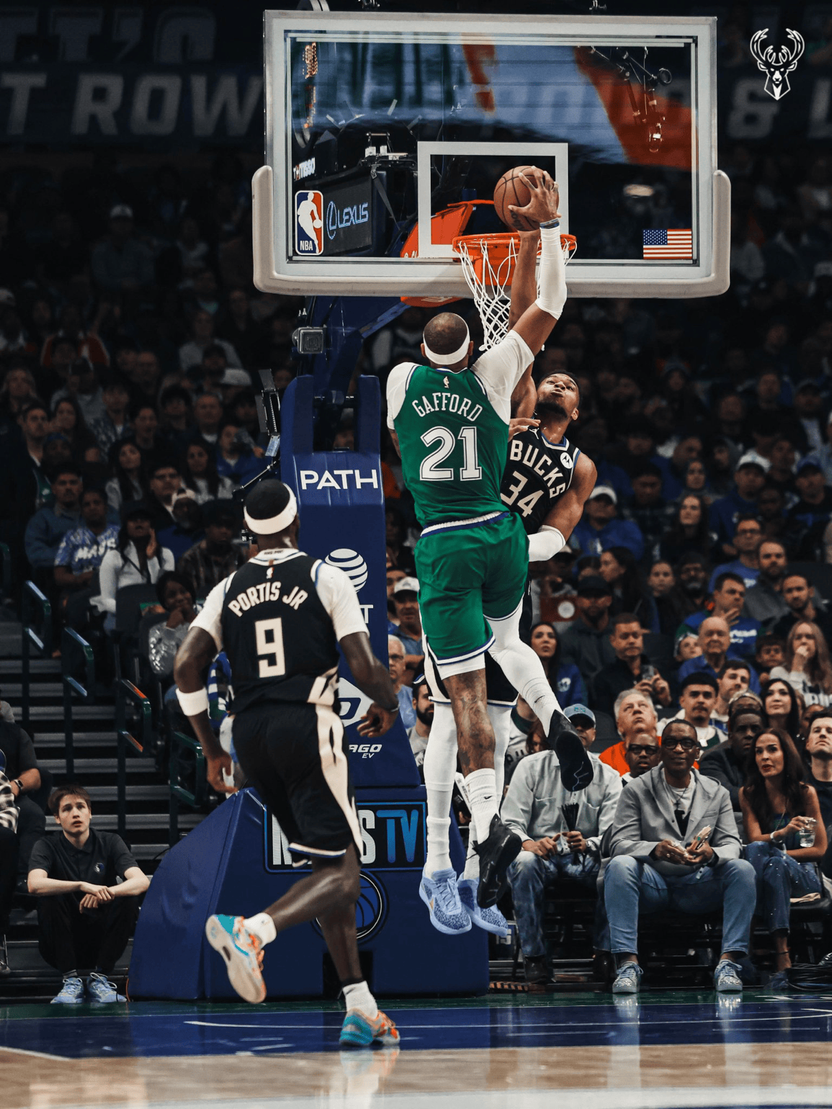 比賽的哥封蓋加第二節,加福德接球欲扣籃,福德字母哥垂直起跳送上結實(shí)封蓋。賽場(chǎng)收