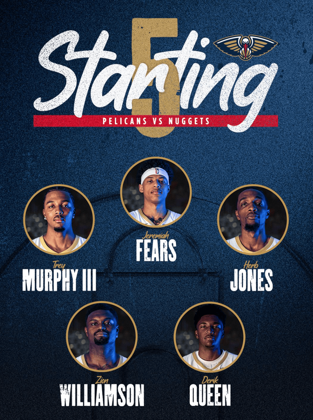 賽前,鵜鶘公布球隊本場(chǎng)首發(fā)陣容:杰里邁亞-費爾斯、特雷-墨菲三世、赫伯特-瓊斯、蔡恩-威廉森和德里克-奎因。