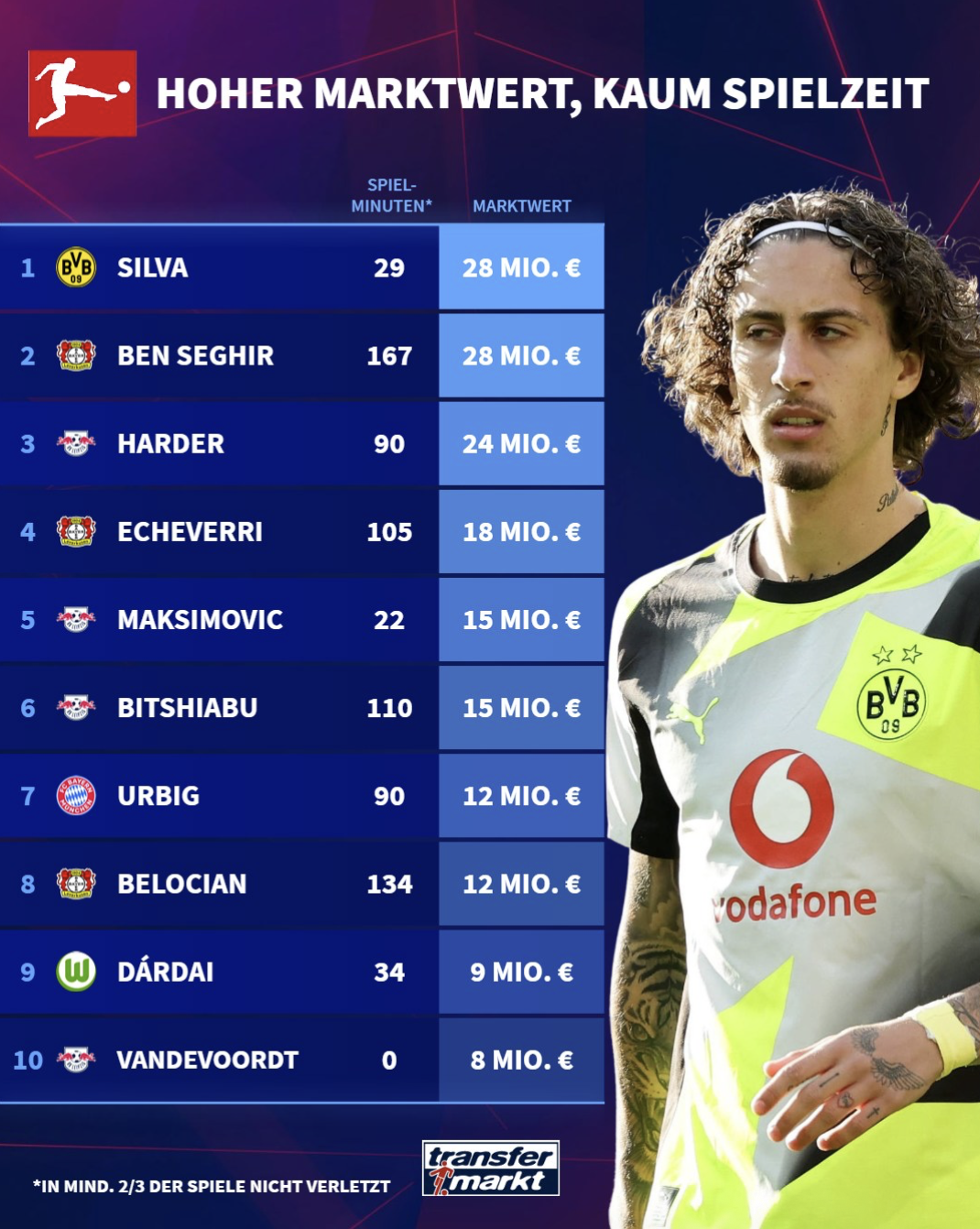 [流言板]本季德甲低出勤球員身價(jià)榜:多特席爾瓦和藥廠(chǎng)本塞吉爾居首