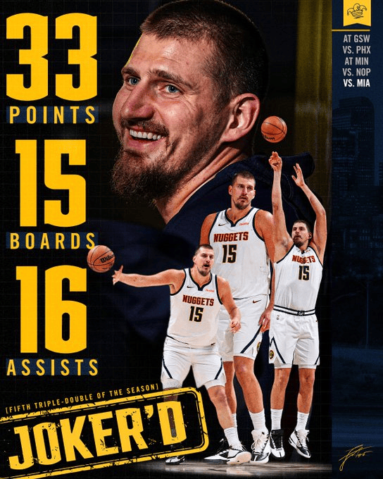 [流言板]掘金曬約基奇數據海報:賽季已5次三雙,而其他球員合計5次