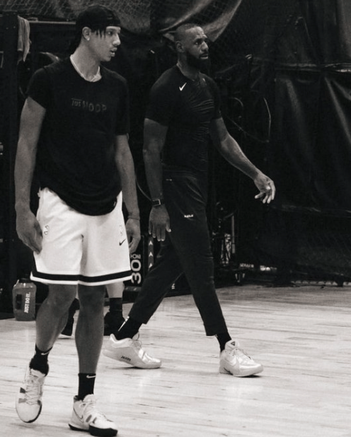 照片中為老鷹球員杰倫-約翰遜與湖人球員勒布朗-詹姆斯一起訓練。流言s老倫