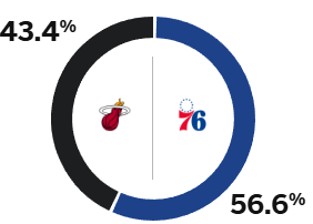 [流言板]ESPN預測明日比賽勝率:76人達到56.6%,而熱火則為43.4%