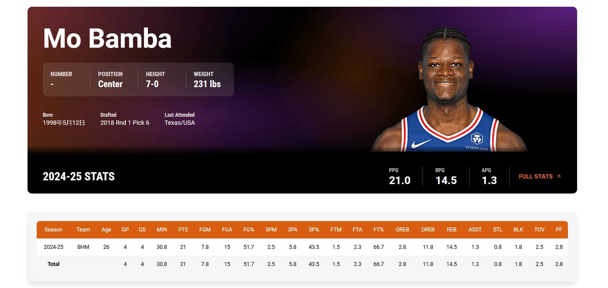 虎撲03月11日訊 根據報道,鵜鶘將與中鋒穆罕默德-班巴簽下一份10天合同。賽季賽場(chǎng)