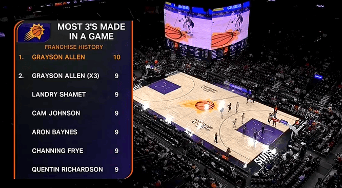 本場(chǎng)比賽,紀錄記領(lǐng)太陽(yáng)球員格雷森-阿倫投進(jìn)10記三分,阿倫打破太陽(yáng)隊史單場(chǎng)三分球紀錄。銜沙遜上