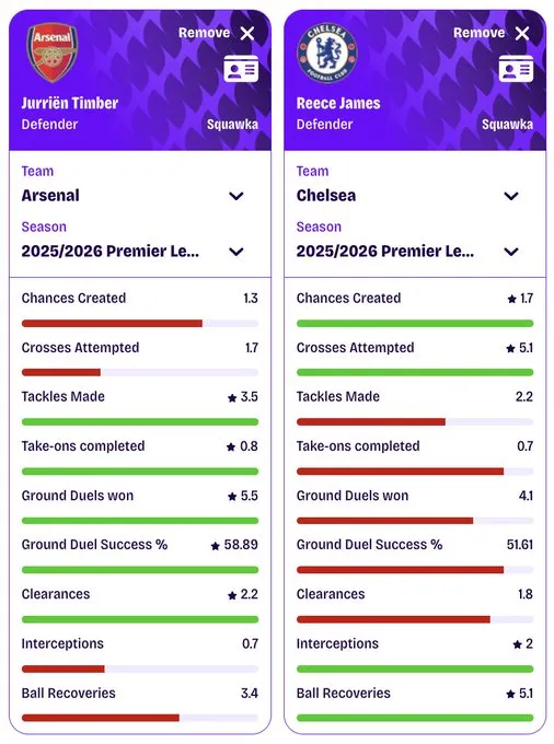 虎撲11月13日訊 Squawka數據統計,以下是斯本數據廷貝爾與里斯-詹姆斯在本賽季英超每90分鐘數據對比(廷貝爾在前):