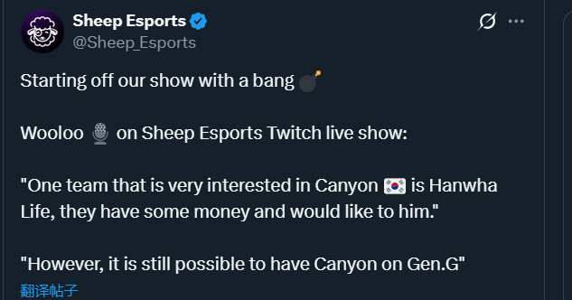 虎撲11月17日訊?據外媒Sheep?Esports成員在直播中透露,目前LCK的想簽下C想留轉會(huì )期談判爭奪非常激烈,HLE很希望簽下Canyon也有足夠的情報資金,但是站外GEN也非常希望留下Canyon,Canyon留在GEN的媒爆可能性依然存在。