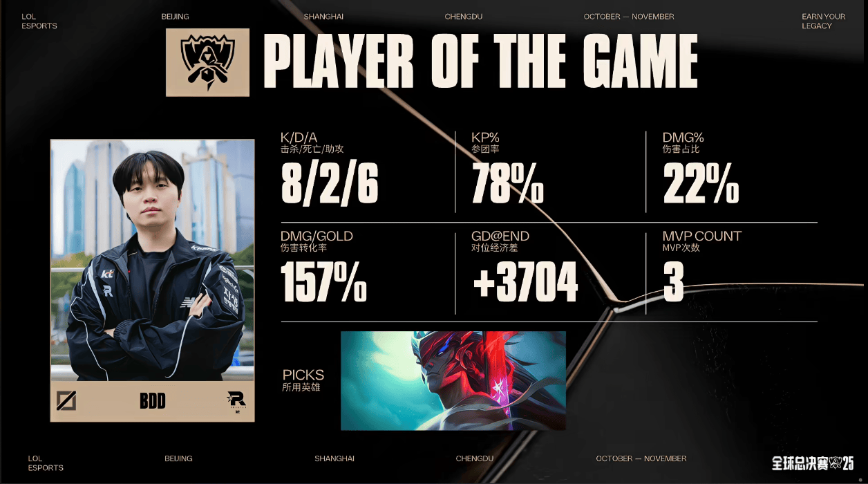 虎撲11月01日訊 在剛剛結束的KT對陣GEN的BO5比賽中,Bdd永恩打出8/2/6戰績(jì),戰績(jì)斬獲斬獲KT對陣GEN第一局MVP