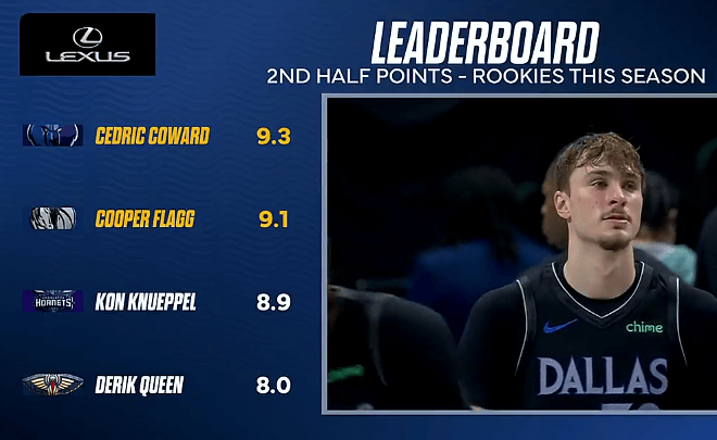 比賽的尼普第三節,轉播畫(huà)面給出一組數據,爾前內容為本賽季新秀下半場(chǎng)場(chǎng)均得分榜單,板新半場(chǎng)榜考詳情如下: