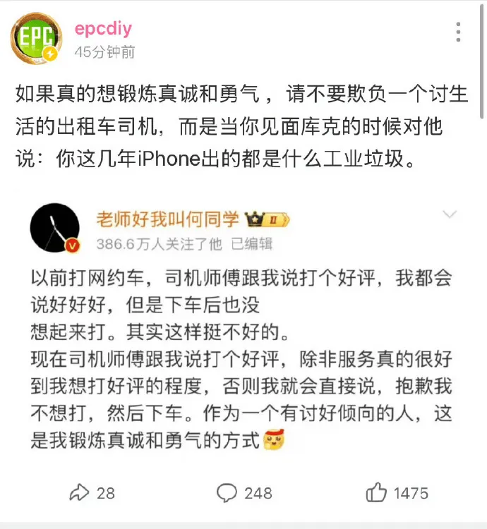 2025年4月11日,何同學(xué)在微博分享打車(chē)經(jīng)歷,稱(chēng)面對網(wǎng)約車(chē)司機索要好評時(shí),除非服務(wù)“好到我想打好評的程度”,否則會(huì )直接拒絕,并解釋這是“克服討好型人格、鍛煉真誠和勇氣的方式”。該言論迅速引發(fā)爭議。