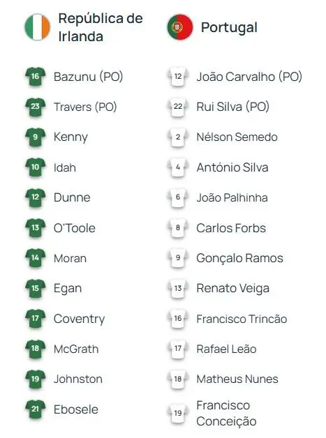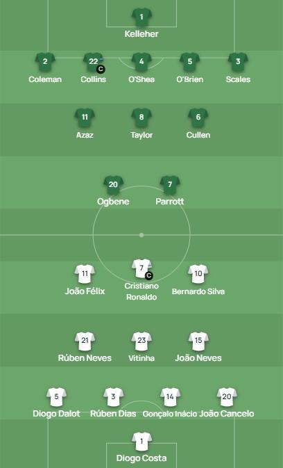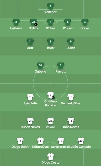 虎撲11月13日訊 世歐預小組賽第9輪,愛(ài)爾蘭對陣葡萄牙,賽前官方公布本場(chǎng)首發(fā)。