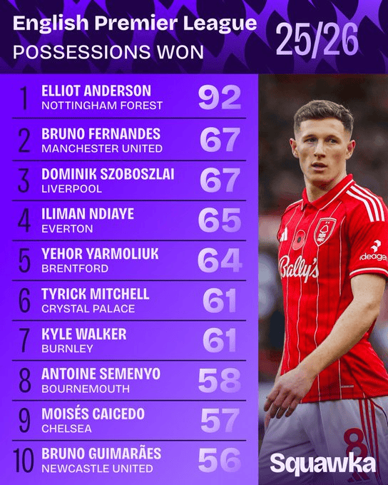 虎撲11月10日訊 Squawka統計截至目前英超本賽季奪回球權次數排名。