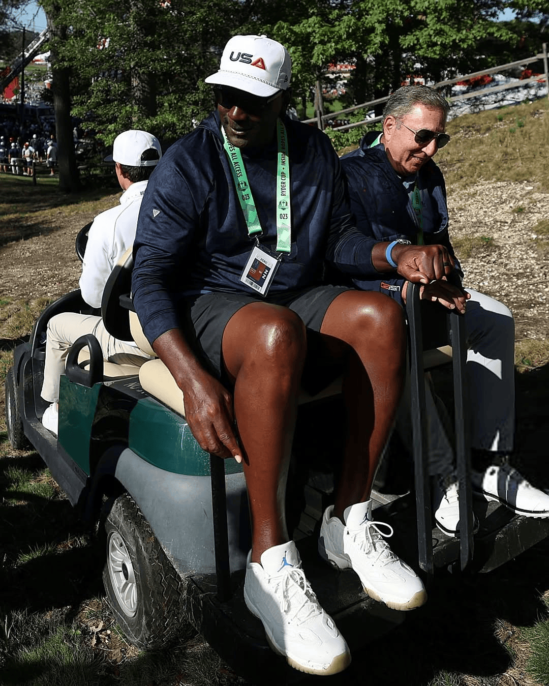 決賽現場(chǎng),自督戰喬著(zhù)邁克爾-喬丹穿著(zhù)Air Jordan 11 Low IE現場(chǎng)觀(guān)戰。丹穿德杯
