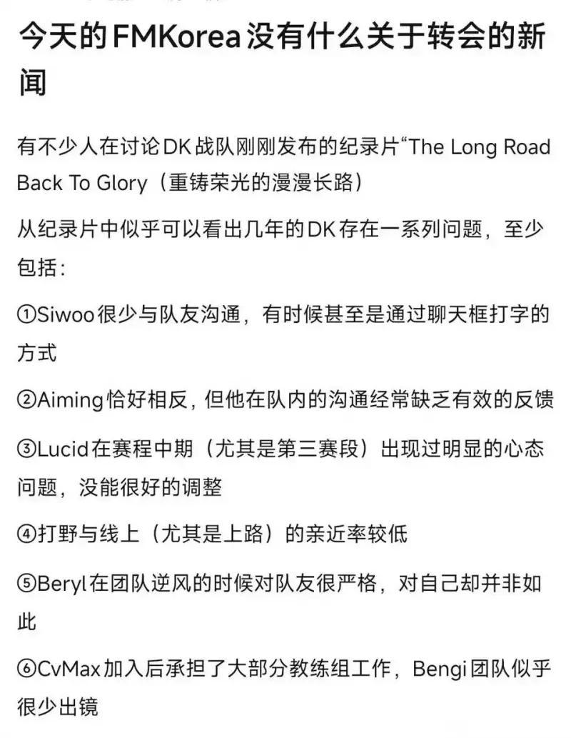 FMKorea在討論DK戰隊剛剛發(fā)布的狗樣溝通紀錄片“The Long Road Back To Glory(重鑄榮光的漫漫長(cháng)路)
