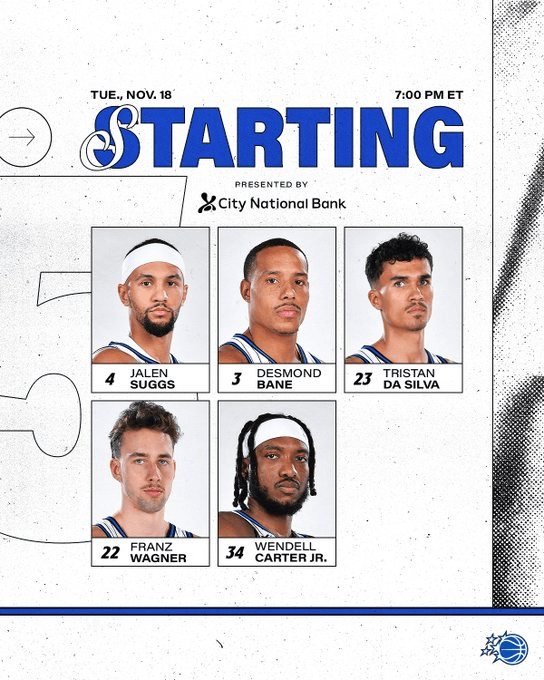 虎撲11月19日訊 魔術(shù)更新官方社媒,公布了今日比賽的術(shù)首薩格斯達首發(fā)陣容。