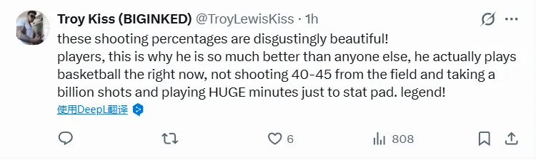 球員們,這就是他遠勝于人的原因,他現在打球的方式才是正確的,而不是靠40-45%的命中率狂刷數據,靠海量出手和超長(cháng)出場(chǎng)時(shí)間刷數據。傳奇!