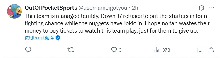 -這支球隊管理得一塌糊涂。落后17分時(shí)偏不派主力上場(chǎng)爭取機會(huì ),而掘金卻派上了約基奇。希望球迷別再浪費錢(qián)買(mǎi)票看這支球隊比賽,他們根本就是放棄了。