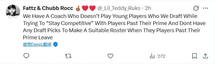-我們有一位教練,他拒絕啟用球隊選中的年輕球員,卻試圖用那些過(guò)了巔峰期的老將維持競爭力。當這些老將退役時(shí),球隊又沒(méi)有選秀權來(lái)組建合適的陣容。