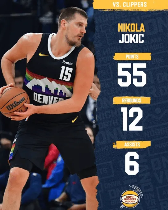 NBA常規賽掘金客場(chǎng)130-116打爆快船,約基奇打出超神一戰,全場(chǎng)23投18中、三分6中5、罰球16中14狂砍55分12籃板6助攻,正負值+28,首節暴砍25分創(chuàng )歷史,一戰狂刷多項紀錄。