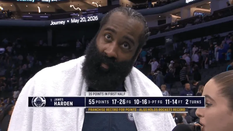 本場(chǎng)比賽,快船球員詹姆斯-哈登出戰35分鐘,26投17中,其中三分球16投10中,罰球14投11中,得到55分3籃板7助攻1搶斷。