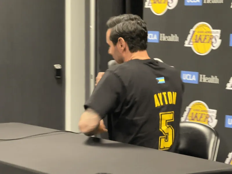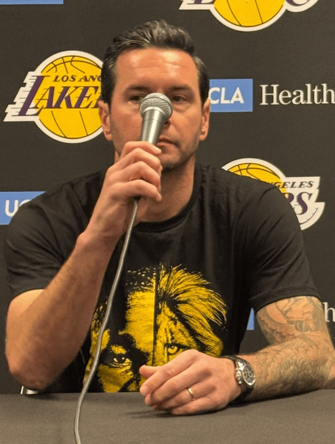 賽前湖人主帥JJ-雷迪克接受了記者采訪(fǎng),穿著(zhù)成JJ-雷迪克穿著(zhù)一件定制版德安德烈-艾頓T恤亮相。獅融