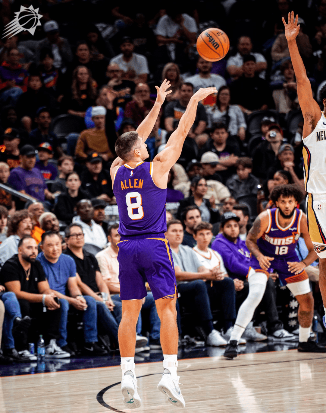 比賽進(jìn)行到第四節,投進(jìn)太陽(yáng)后衛格雷森-阿倫三分球已經(jīng)15投10中。記分紀錄