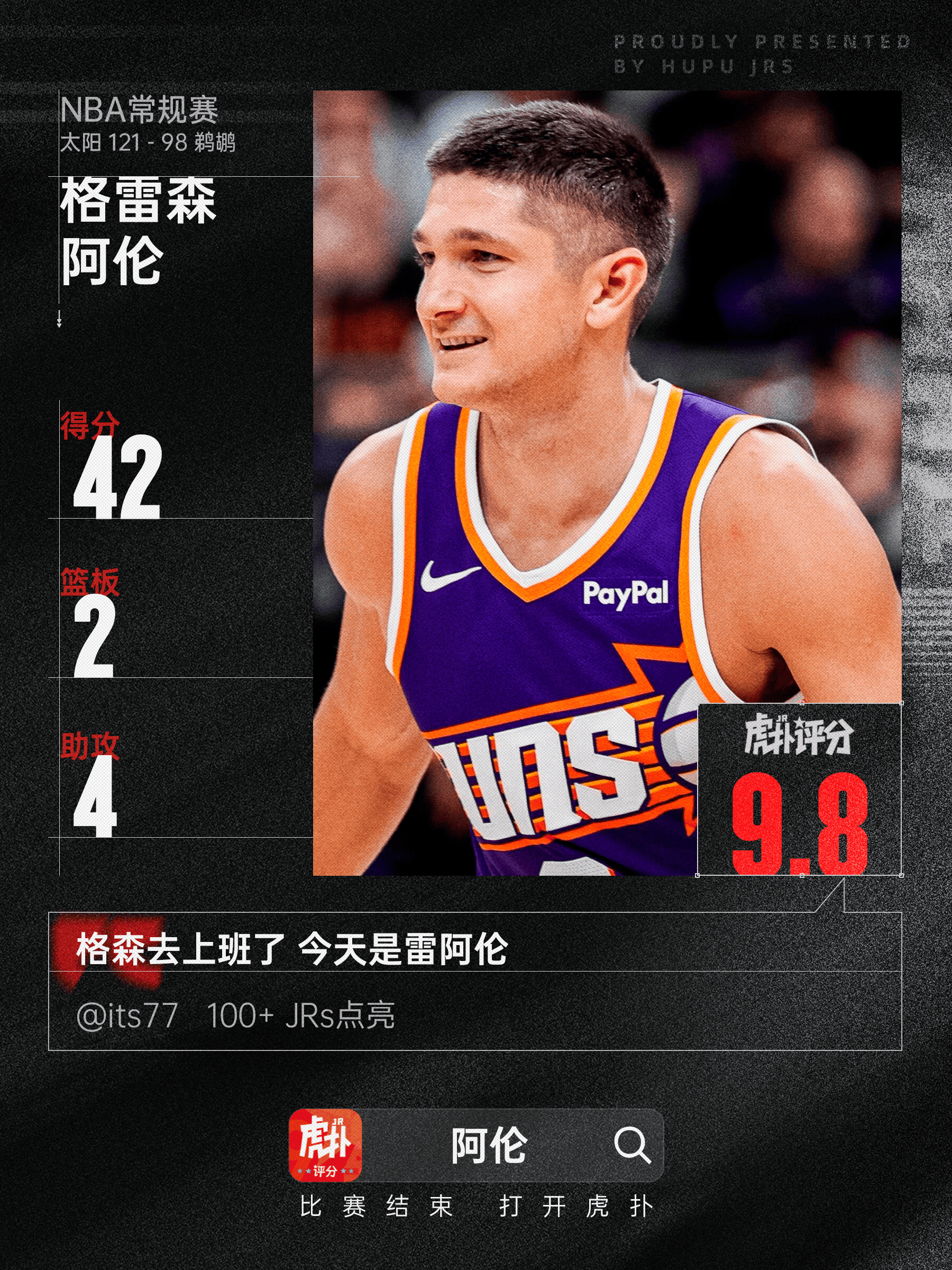 本場(chǎng)比賽,板生太陽(yáng)球員格雷森-阿倫出戰27分鐘,涯新17投12中,其中三分球15投10中,罰球10投8中,得到42分2籃板4助攻3搶斷。