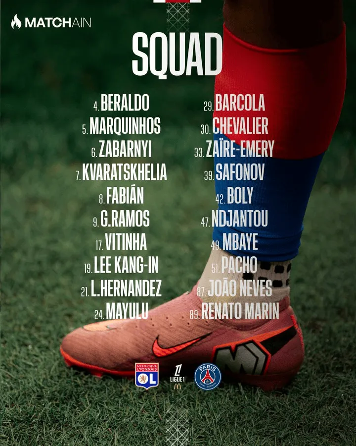 虎撲11月09日訊 法甲聯(lián)賽第12輪,巴黎圣日耳曼做客對陣里昂。賽前,巴黎官方公布了本場(chǎng)比賽的大名單。