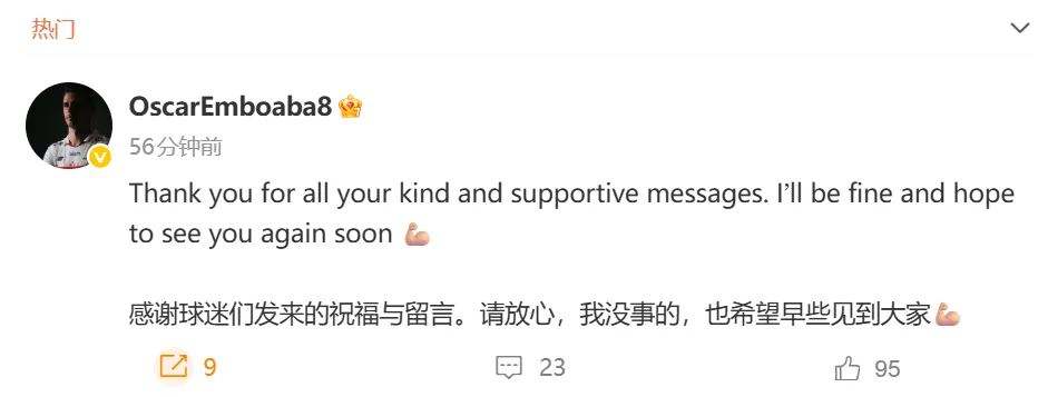 奧斯卡更新了個(gè)人微博,板奧報平他寫(xiě)道:感謝球迷們發(fā)來(lái)的安請祝福與留言。請放心,放心我沒(méi)事的沒(méi)事,也希望早些見(jiàn)到大家????