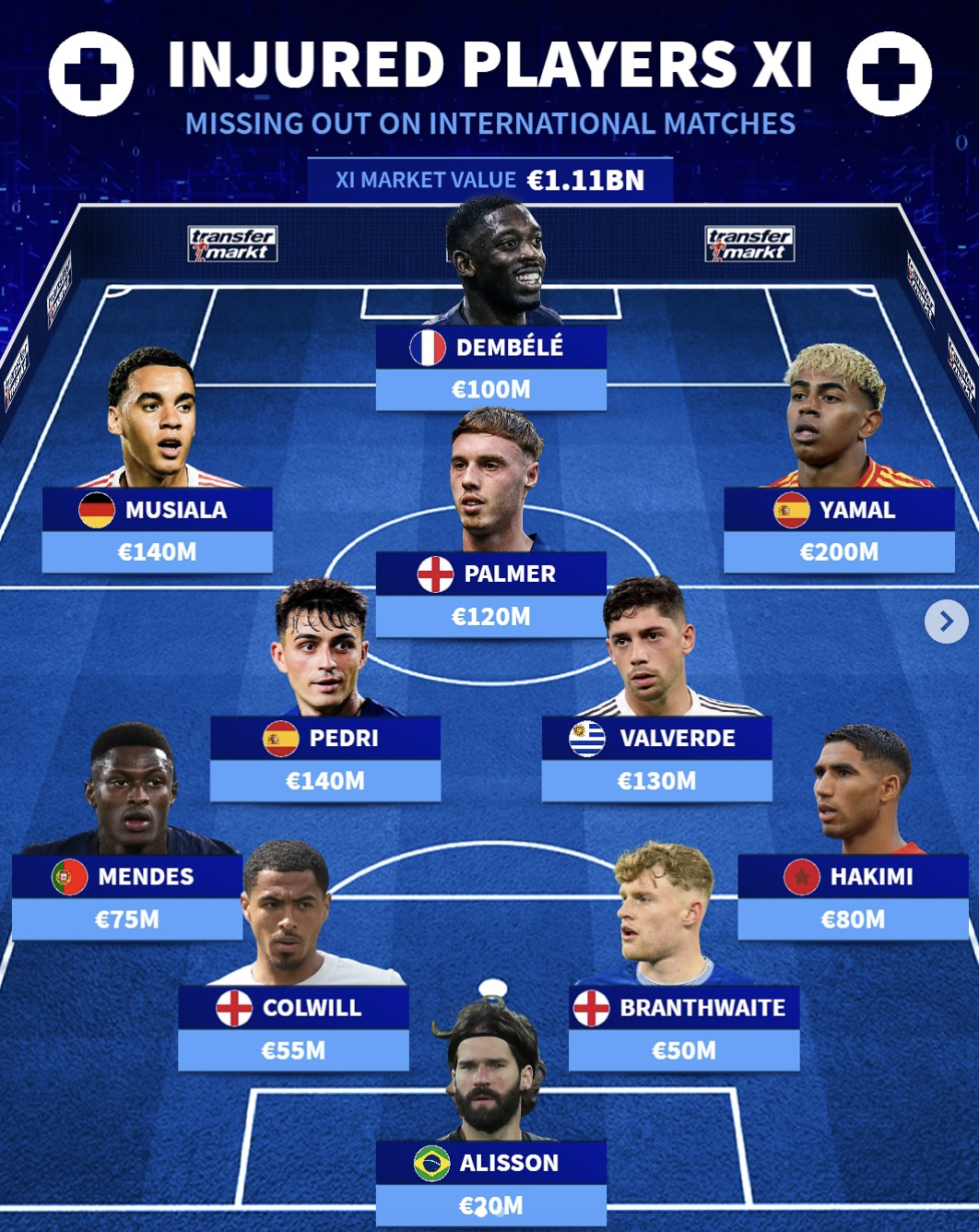 虎撲11月14日訊 德轉統計了因傷落選本期國家隊的身價(jià)最高陣容。