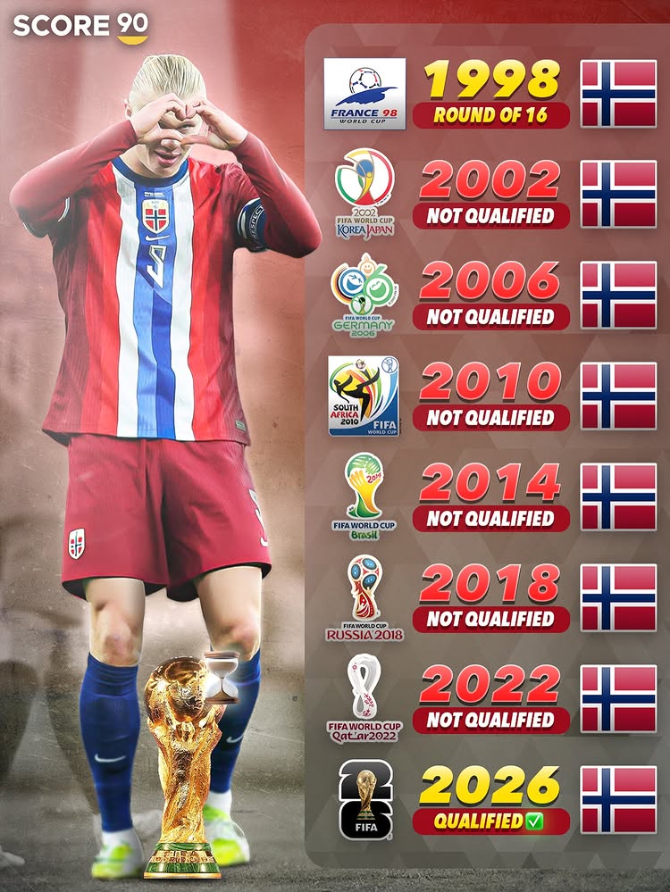 根據Score 90的板基本鎖統計,挪威在本屆世預賽7場(chǎng)比賽取得全勝,打進(jìn)33球,僅丟4球。他們上一次參加世界杯還是在1998年,歷經(jīng)28年的漫長(cháng)等待,挪威人民將很接近看到他們的國家參加明年的世界杯。
