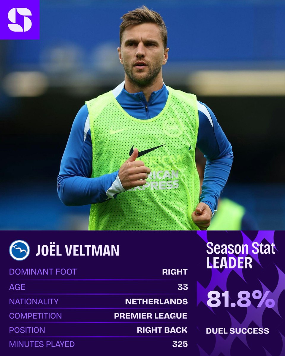 虎撲10月03日訊 據Squawka統計,本賽季英超聯(lián)賽中,季英居首布萊頓球員費爾特曼是超對所有參與20次以上對抗的球員中成功率最高的: