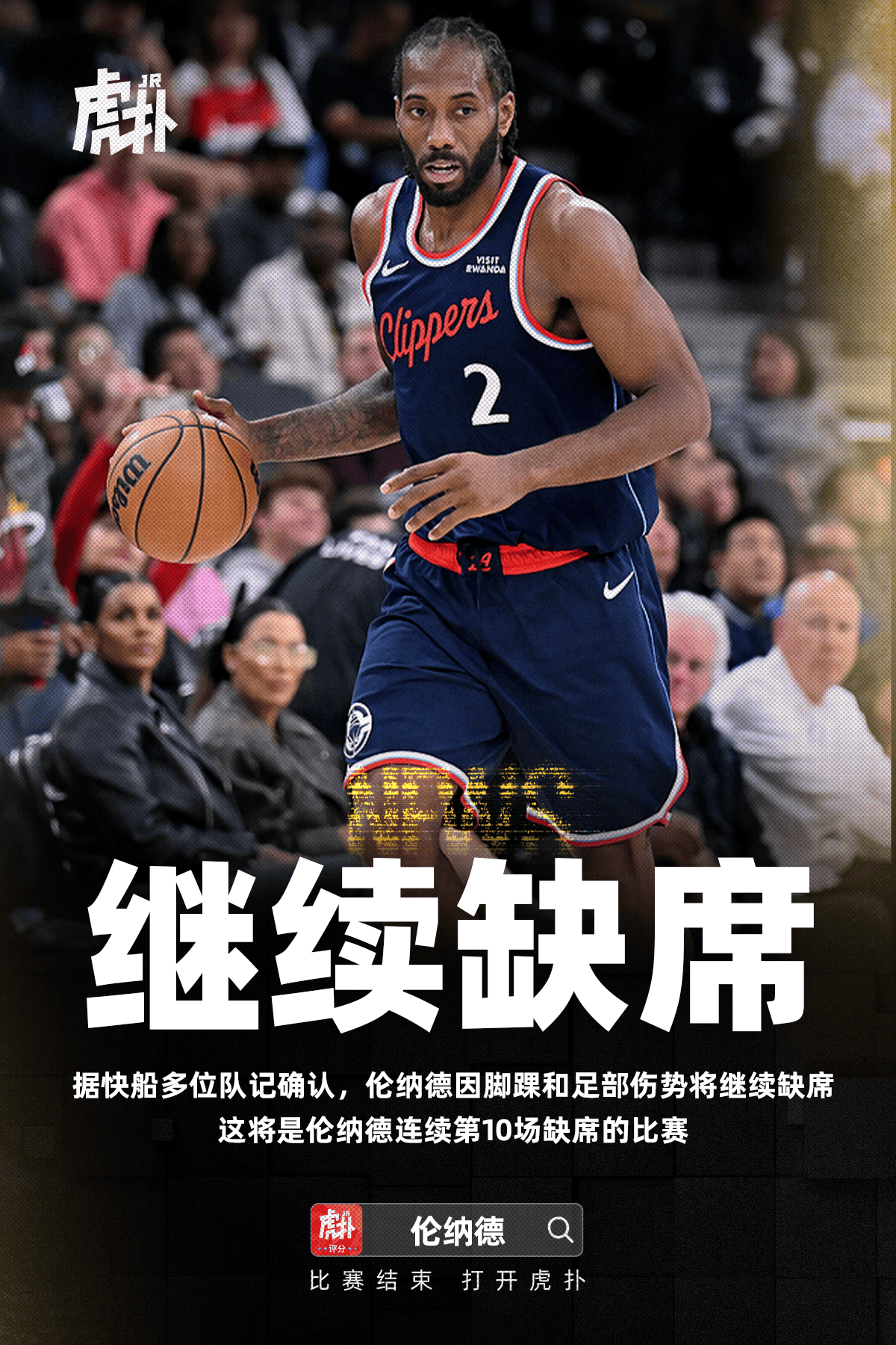 據快船多位隊記確認,缺席科懷-倫納德因腳踝和足部傷勢將繼續缺席。流言連續