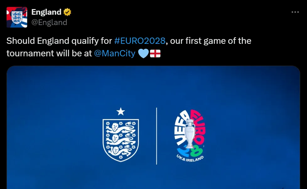 英格蘭國家隊官方隨后發(fā)帖稱(chēng),如果英格蘭晉級2028歐洲杯,他們在該屆賽事的首場(chǎng)比賽將在曼城主場(chǎng)伊蒂哈德舉行。