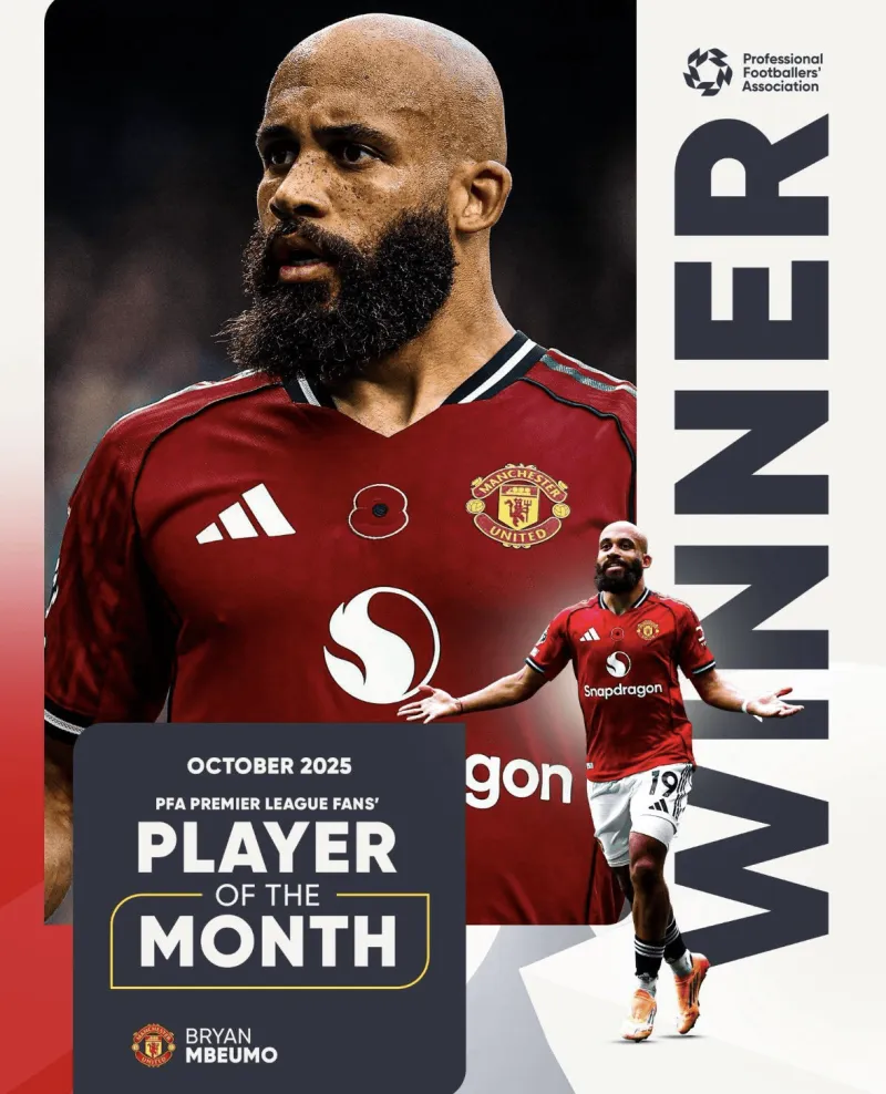 姆博莫被評為PFA球迷票選十月月度最佳球員