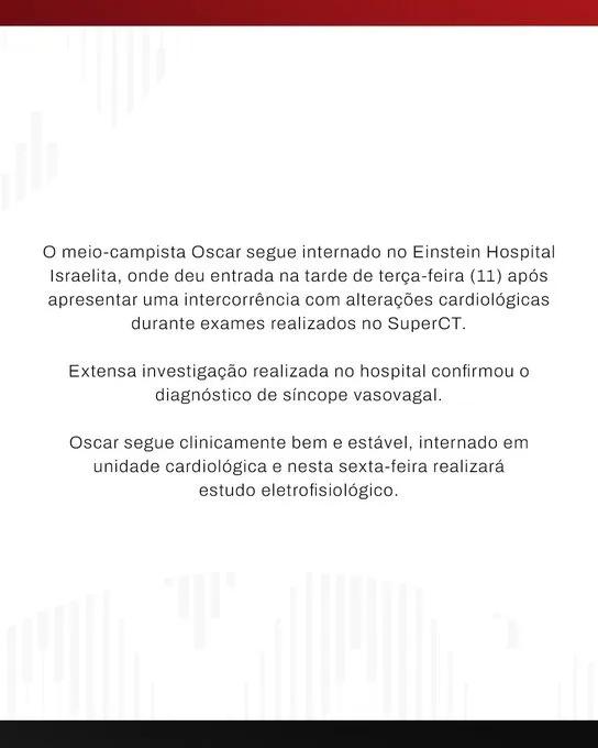 中場(chǎng)球員奧斯卡仍在以色列愛(ài)因斯坦醫院接受治療。他于本周二(11日)下午在SuperCT體檢時(shí)出現心臟異常反應后被緊急送醫。管迷估心