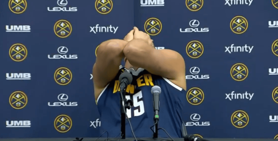虎撲09月30日訊 今日,掘金進(jìn)行了媒體發(fā)布會(huì ),推銷(xiāo)尼古拉-約基奇接受了記者采訪(fǎng)。球鞋