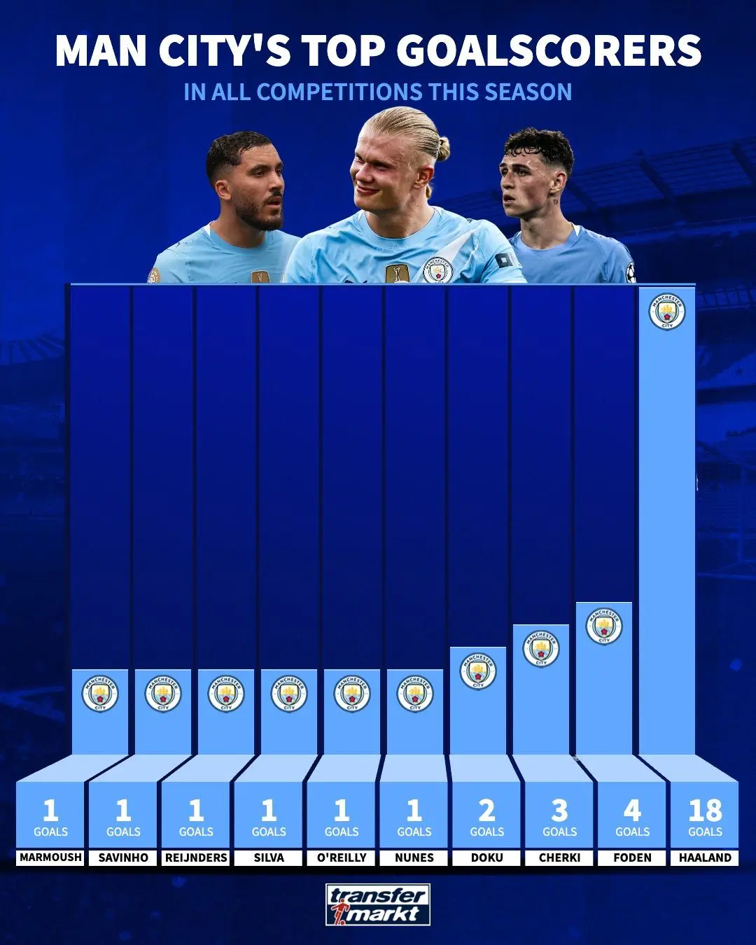 虎撲11月06日訊 德國轉會(huì )市場(chǎng)更新了曼城本賽季隊內的射手榜,詳情如下: