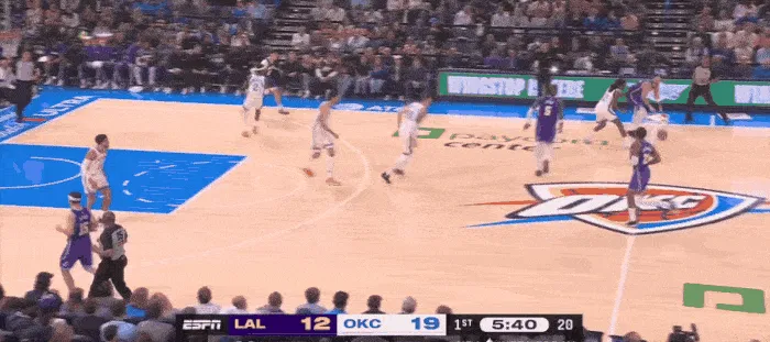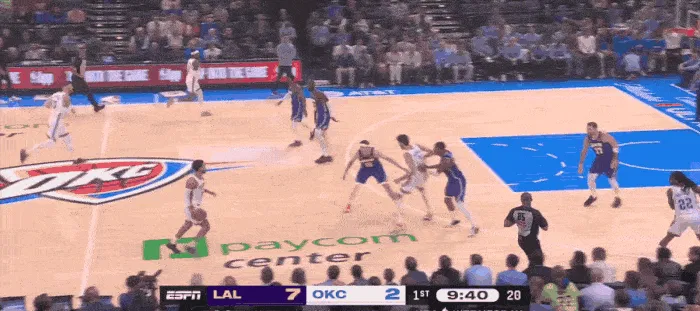 首先通過(guò)賽后數據統計,我們可以很直觀(guān)地看出一個(gè)問(wèn)題,在籃板和罰球持平的情況下,雷霆這邊是高助攻數低失誤,湖人卻是助攻更少失誤更多。這可以說(shuō)是本場(chǎng)比賽的一個(gè)重要符號,雷霆快速的輪轉和夾擊,導致湖人大量的失誤。那么他們是如何防守,造成湖人這種現象的呢?