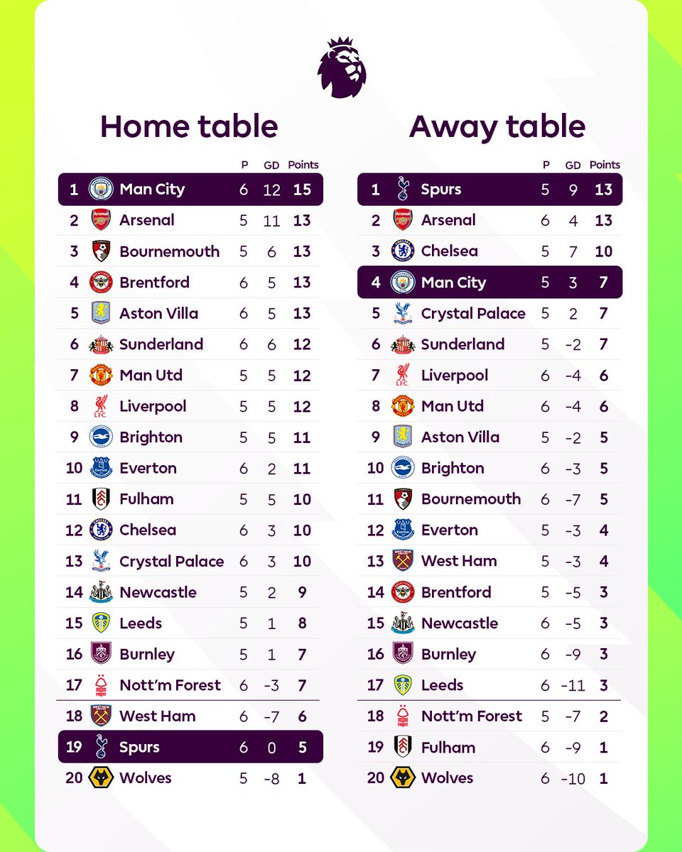在主場(chǎng)榜中,曼城依舊展現強勁統治力,6個(gè)主場(chǎng)豪取15分位居榜首,唯一的失分是第2輪0-2不敵熱刺。阿森納緊隨其后,積13分。相反,熱刺主場(chǎng)表現不佳,6場(chǎng)比賽僅拿到5分,排名倒數第二,僅優(yōu)于墊底的狼隊。