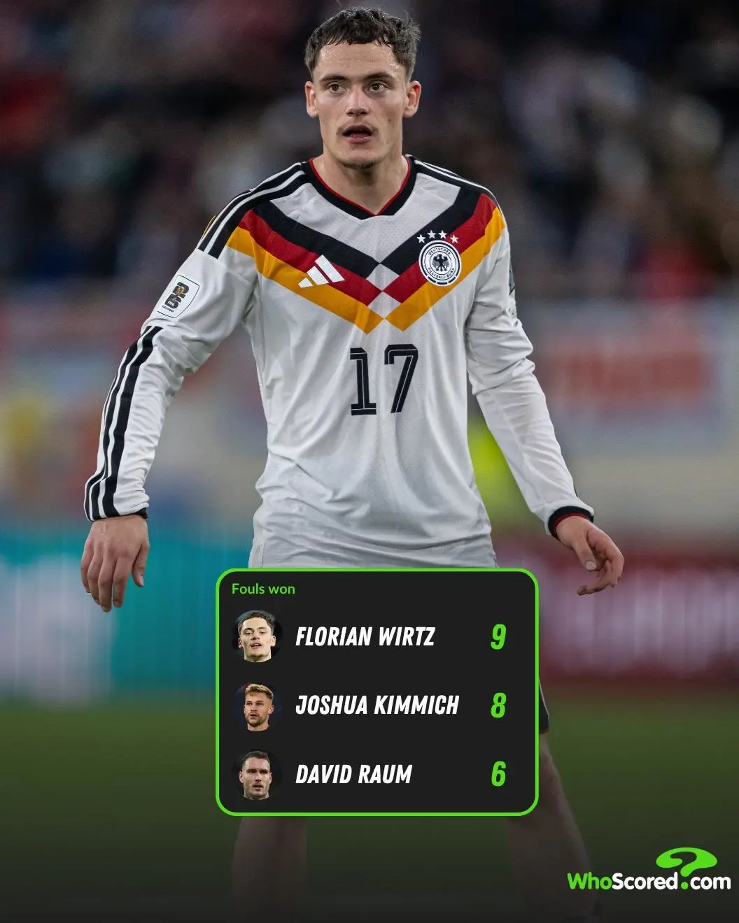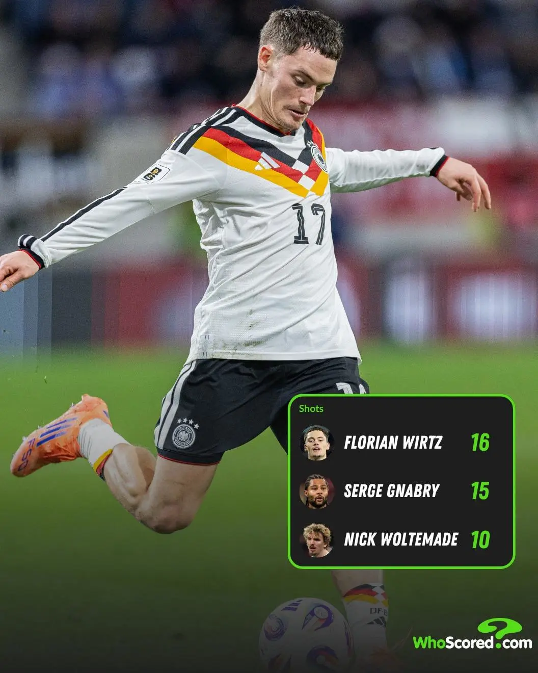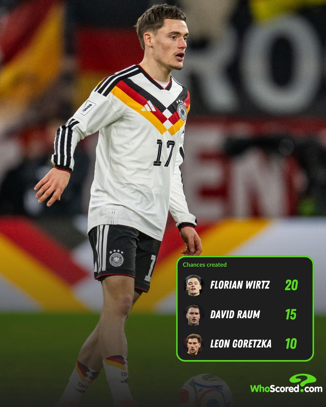 賽后,人次WhoScored對維爾茨在本屆世預賽中的為隊整體表現進(jìn)行了統計,他在多項關(guān)鍵數據上均排在德國隊第一:
