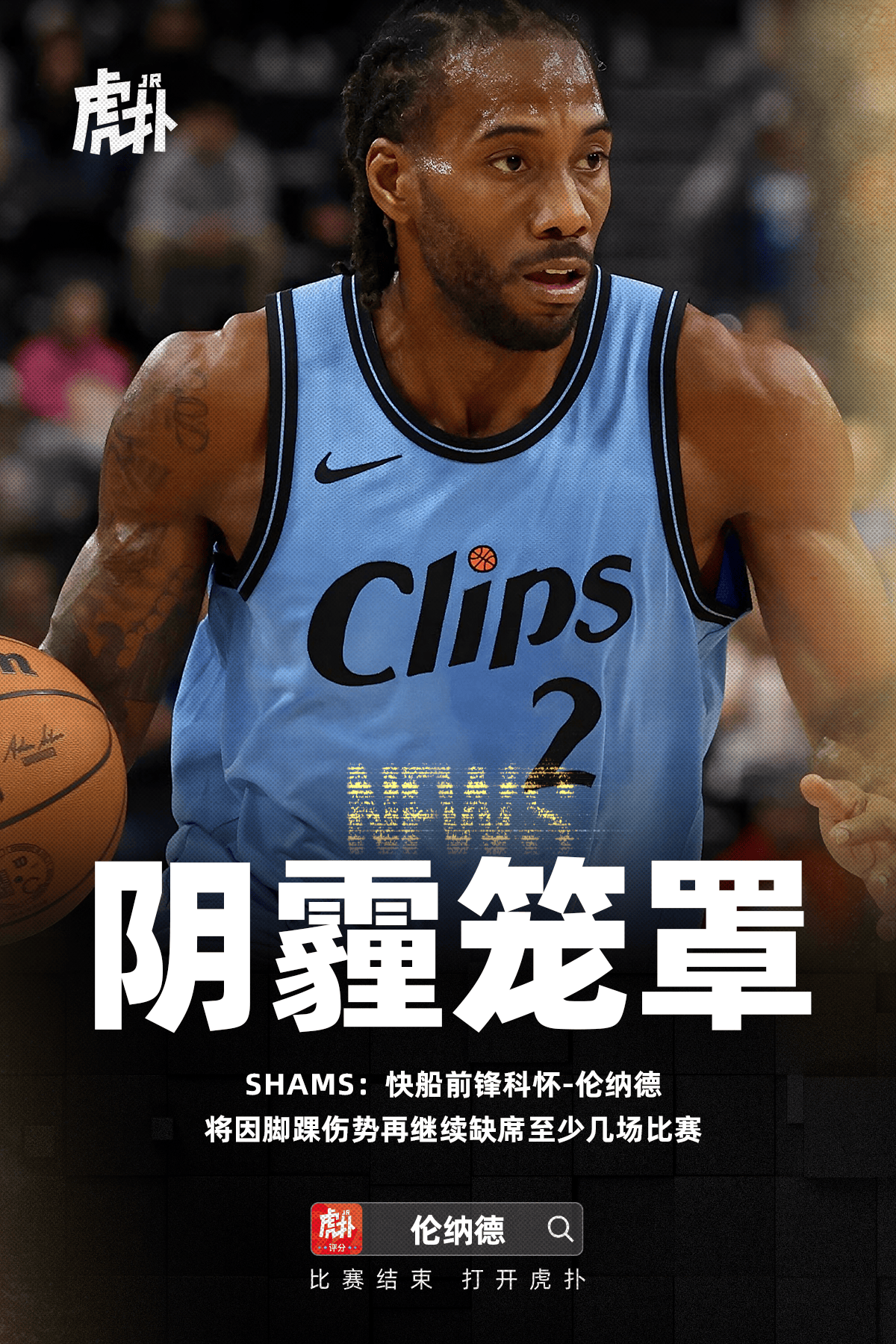 Shams表示科懷-倫納德(腳踝傷勢)將再缺席至少幾場(chǎng)比賽。因腳