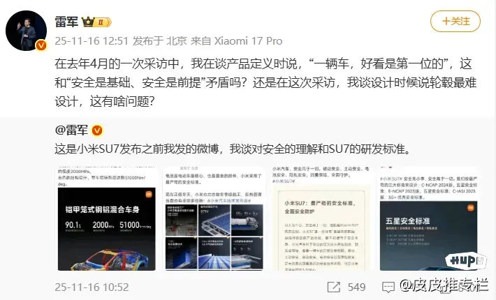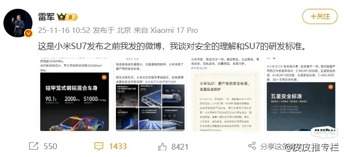 他還在微博附上了他于2023年和2024年發(fā)布的四條微博截圖,這些內容都顯示雷總“安全高于一切”的觀(guān)點(diǎn)。