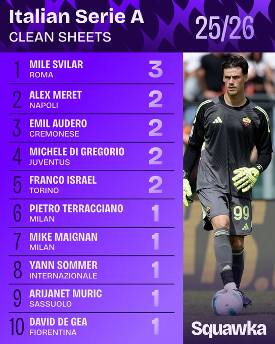 虎撲09月25日訊 Squawka數據統計,羅馬門(mén)將斯維拉爾在2025年的維拉24場(chǎng)意甲比賽中完成了14場(chǎng)零封,這一數據比其他意甲門(mén)將都至少多出3場(chǎng)。爾年