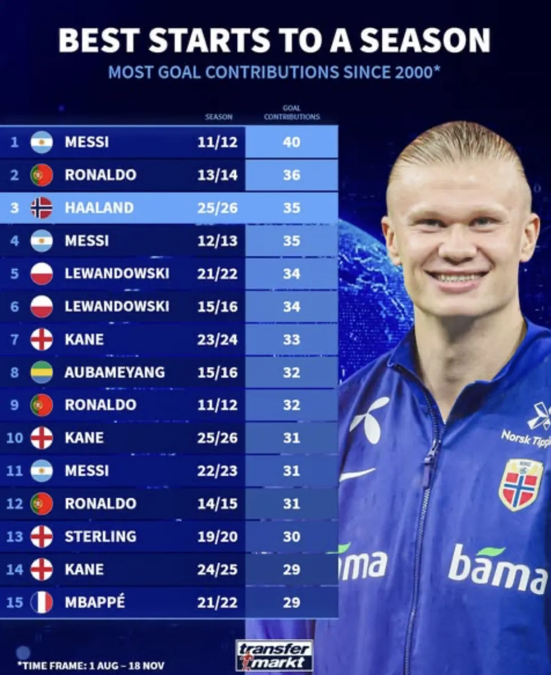 [流言板]本世紀球員賽季初參與進(jìn)球榜:梅西C羅前二,本季哈蘭德第三