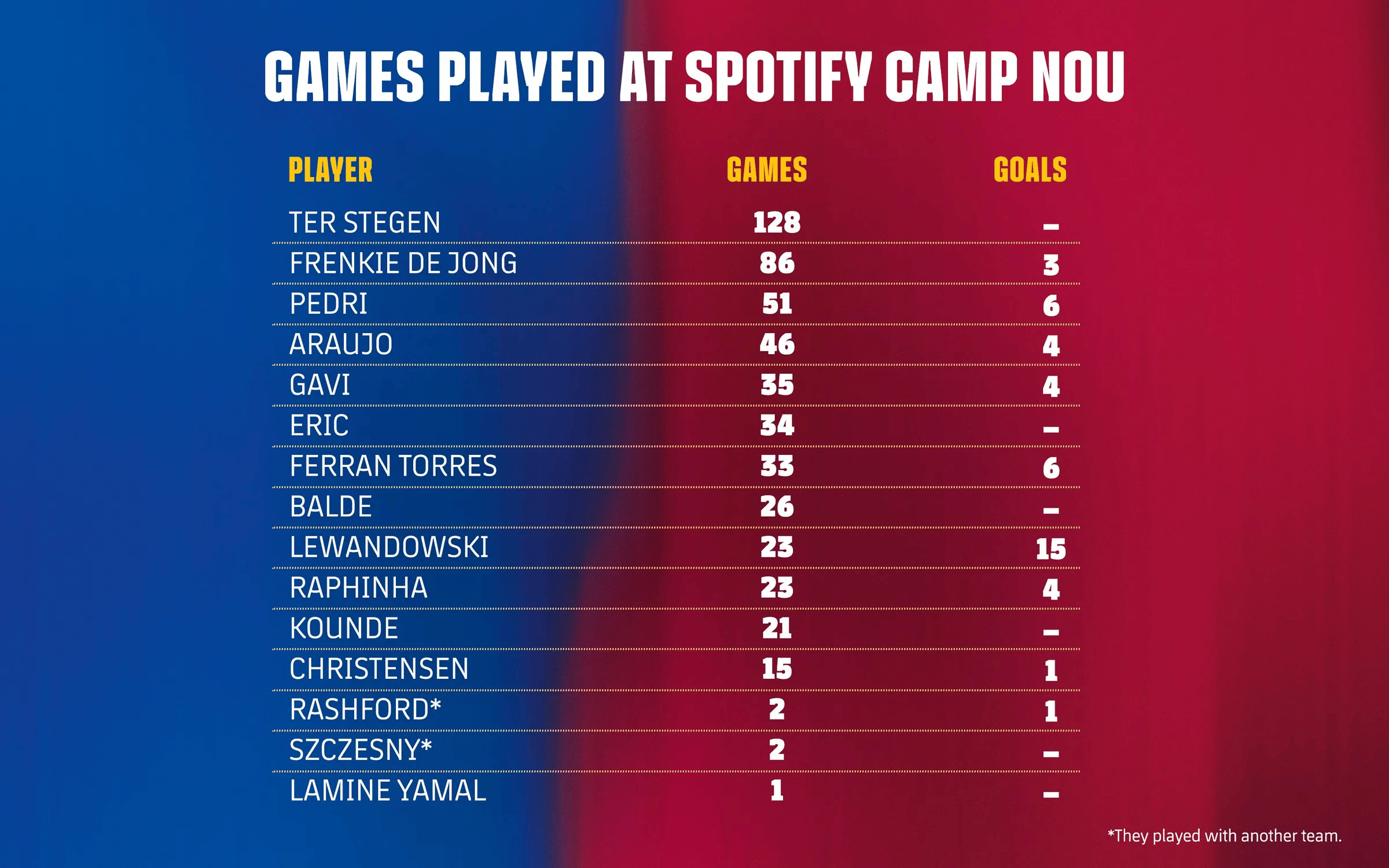虎撲11月19日訊 巴薩官網(wǎng)對現役一線(xiàn)隊球員在諾坎普的出場(chǎng)數據進(jìn)行了統計,門(mén)將特爾施特根以128場(chǎng)位居首位,德容和佩德里分列二三位,分別為86場(chǎng)和51場(chǎng)。值得一提的是,拉什福德和什琴斯尼此前曾以對手身份在這里出場(chǎng),本周末他們有望第一次以巴薩球員的身份亮相諾坎普。